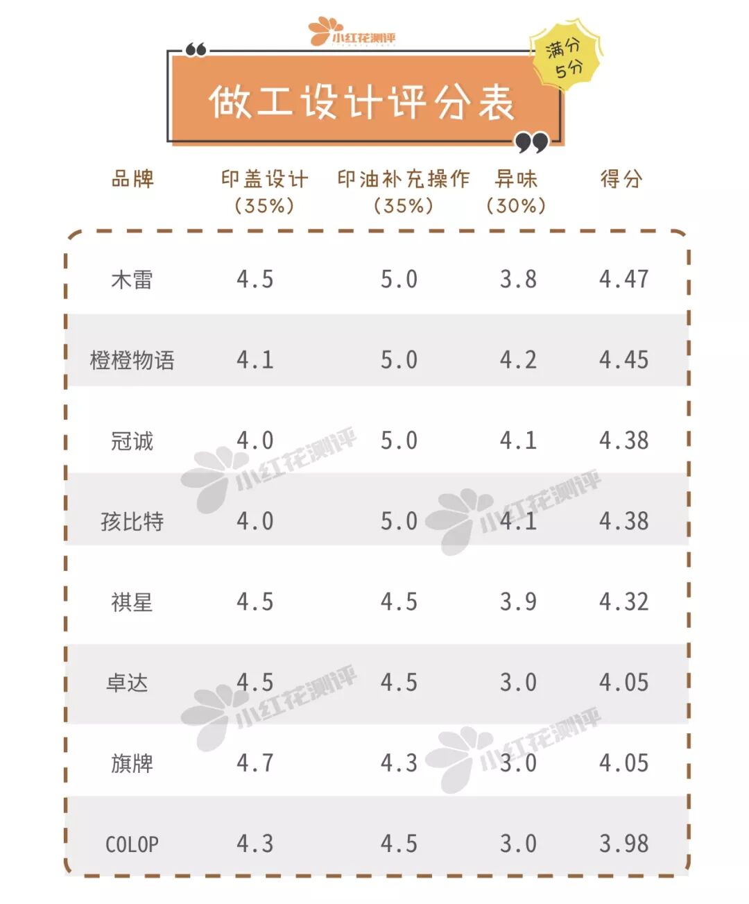 综合上述4个指标,花花根据其重要性划分权重,再赋分,最后加权平均得出8款定制儿童姓名印章使用性能总体评分如下:第一轮测试过后,旗牌、木雷、孩比特综合排名靠前,因此进入第二轮测试——实验室安全性检测。印章的油墨中可能含有一些有害金属,尽管盖印大多数都由大人操作,但是油墨被印在了孩子的衣服或水杯上后,还是有可能会接触到宝宝。为了验证油墨的安全性,花花将前三名送到检测机构进行8项有害金属元素的检测。▲根据国家强制性标准《GB 21027-2007 学生用品的安全通用要求》进行检测经实验室检测,3款印章的印油均未检出8项有害金属,安全有保障。通过各项指标对比,排名靠前的3款印章在各类材质的盖印上都各有优势。若是多用于衣物,花花推荐在衣物上盖印效果表现更好的木雷;如果是多用于光滑弧面物品,例如水杯、饭碗等,花花推荐速干性和持久性均较好的旗牌。