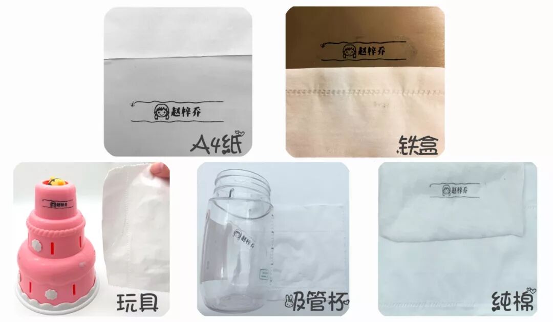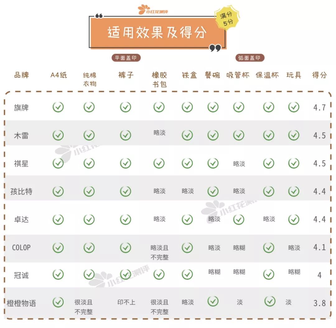 3.冠诚和孩比特则存在通病——墨盒和手柄连接不够紧密,墨盒有时容易松脱。印章盖好以后,如果不能在短时间内干掉,就容易沾到其他地方或者被涂抹晕开,导致印迹模糊。测试方法:分别在A4纸、铁盒、玩具、纯棉衣服、吸管杯上盖印,1分钟后用纸巾平铺在上按压,观察纸巾上油墨印记的深浅。1.旗牌的速干性最好,无论是纸、金属还是塑料上的印迹,1分钟后的干燥程度较高,经按压后印迹完整,纸巾上基本没有墨水印记。其次表现较好的为橙橙物语、木雷。但橙橙物语很大程度上是因为本身的印迹淡,所以纸巾上也没残留多少墨水印记。2. COLOP、卓达、祺星、冠诚这四款印迹速干性表现较差,1分钟后用纸巾平铺按压,印迹容易被涂抹掉,且可以完整复制到纸巾上来。