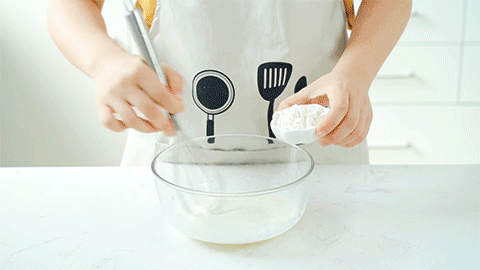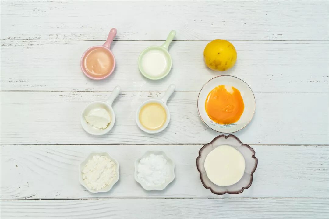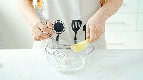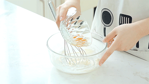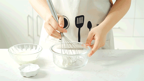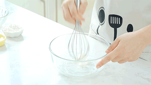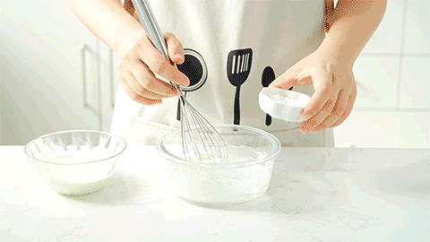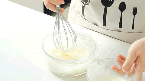 它做起来有点像戚风,但整体的含水量多,尽可能维持蛋白的泡沫非常关键,所以在混合时材料时要特别小心。