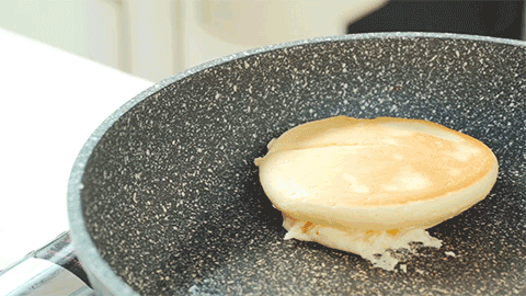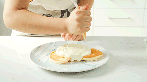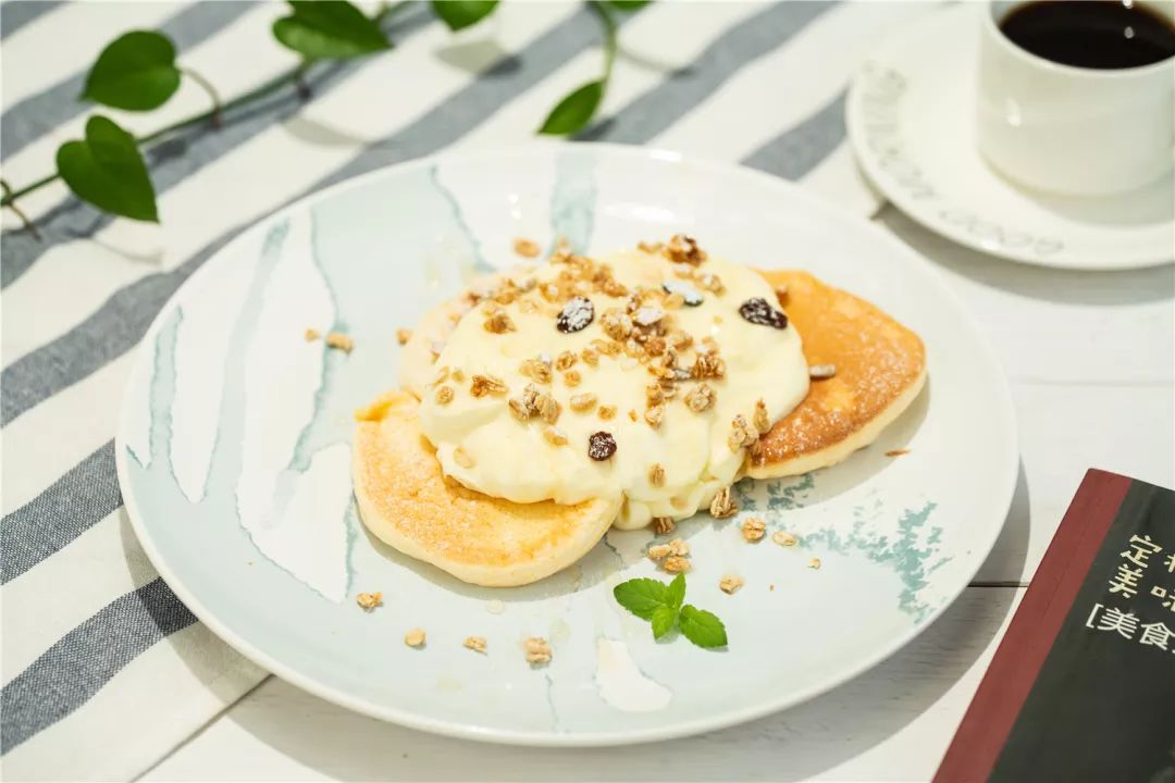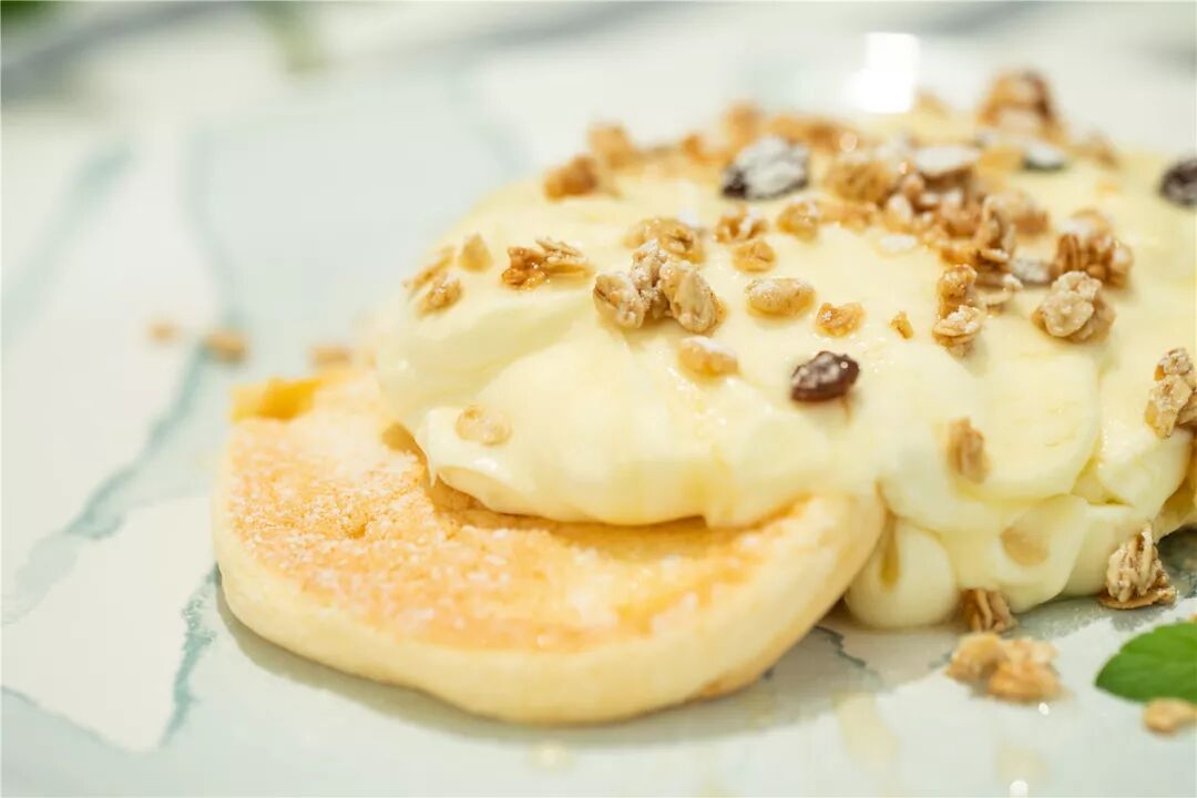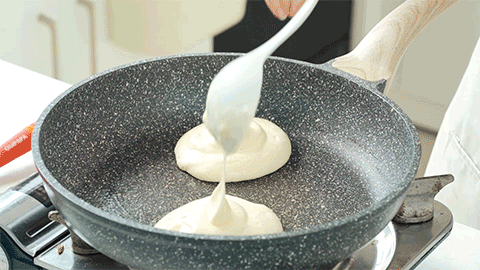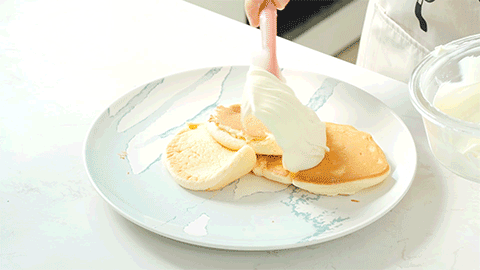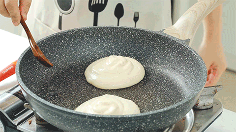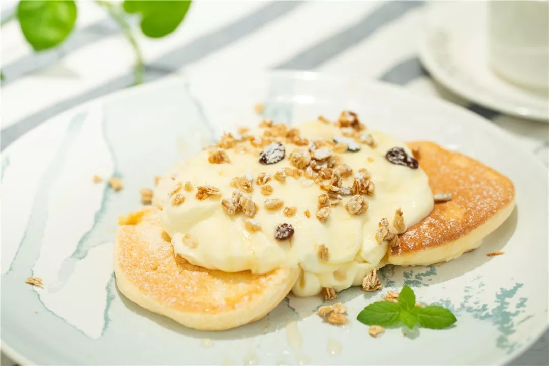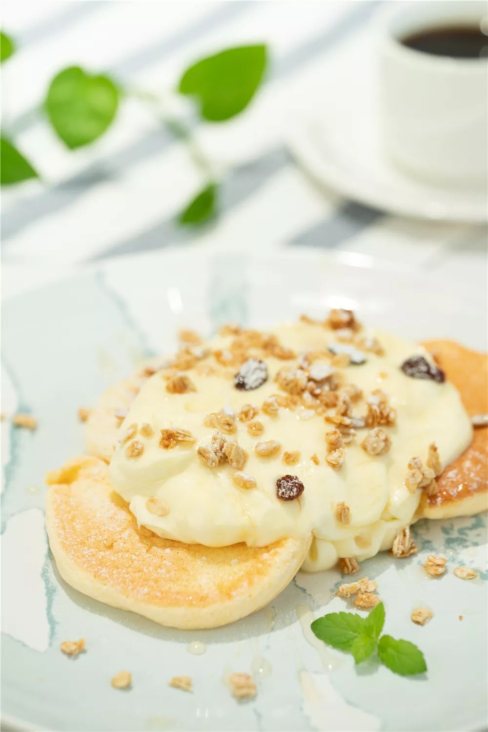 做好的材料往平底锅上一摊,再用小火慢慢烘熟即可。最后再淋上一些奶油霜,吃起来味道更佳哦~