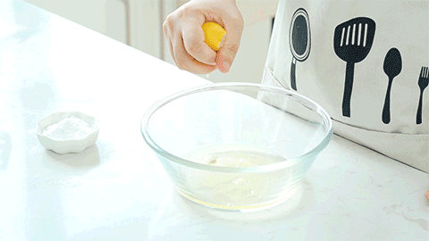 5、另取一碗,放入2个蛋白、2克柠檬汁,再分三次加入20克细砂糖,打发至硬性发泡状态,蛋白霜就打发好啦