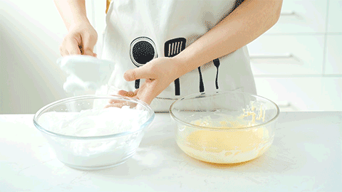 6、将打发好的蛋白霜分三次加到第4步的蛋黄糊里,用切拌和翻拌结合手法进行混合