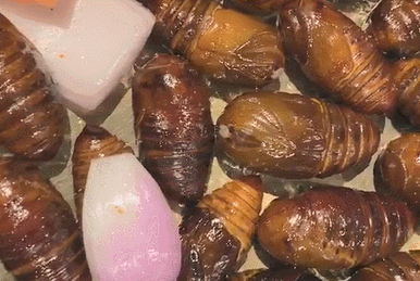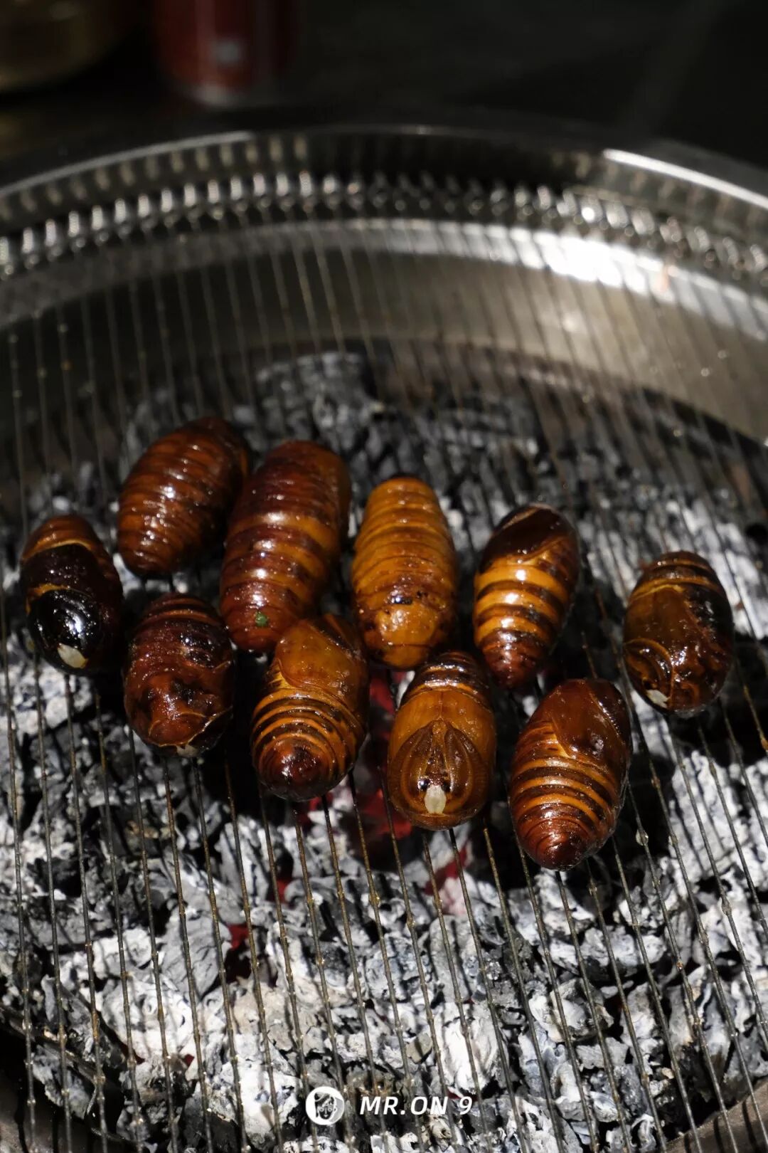 在炉心翻滚六七分钟就够,起初蚕蛹还会在炉上翻滚片刻,后来就不挣扎了,还有蛋白质从壳内流出,形成挂浆。