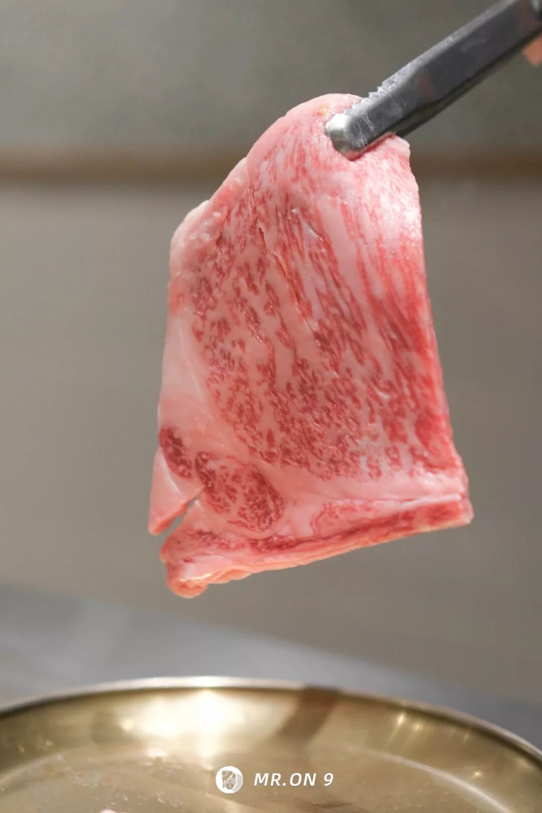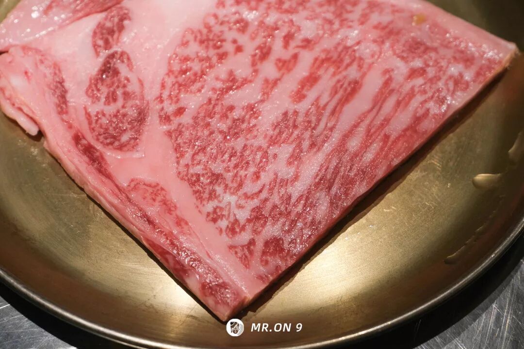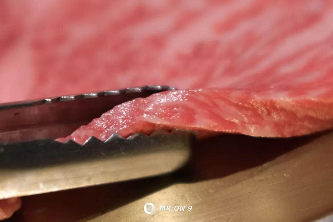 肉质纹理丰富,肥瘦分布犹如大理石花纹,又如霜降在红色玉石上,厚度1cm左右。
