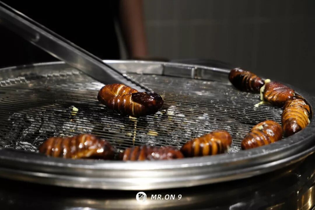 事因这家店比我更够胆。一家东北烤肉店,居然敢把蚕蛹摆上台接受广东人民的评分…..而这个蚕蛹,居然还是活的!你看…..