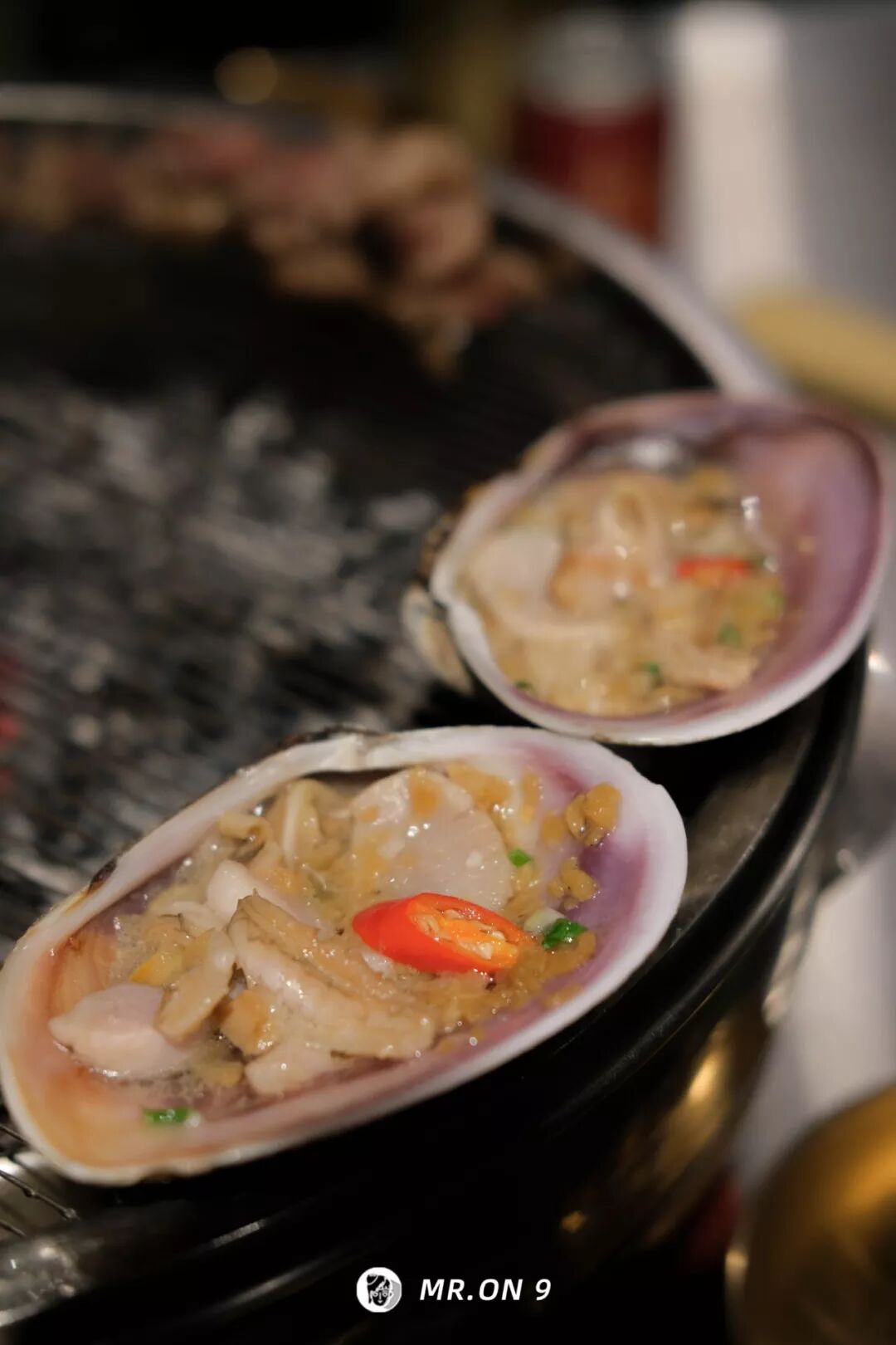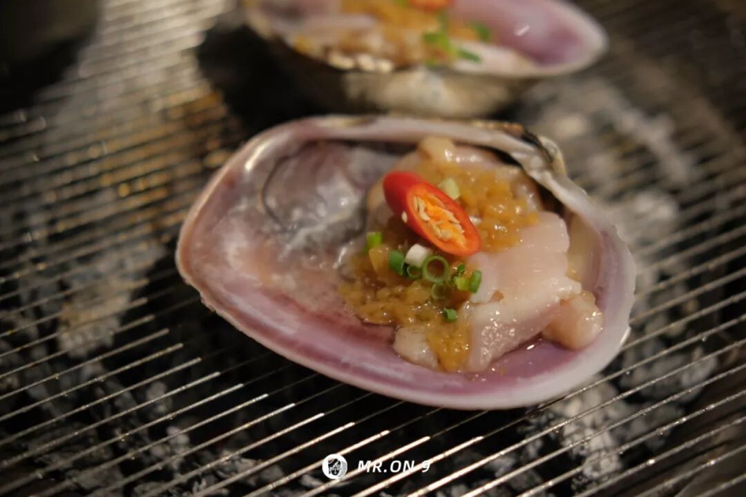 天鹅蛋的烤制无需用心,放置炉心沸腾,蒜泥的香味被核桃炭缓缓逼出,贝肉变色即可。