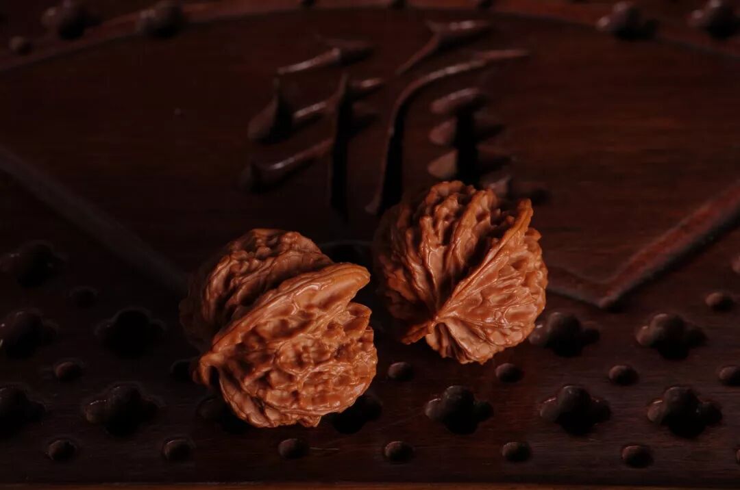在一捻一撸之间,手汗会均匀渗透入核桃的纹理处,两个核桃进行碰撞磨合,来回往返多年,核桃达到温润如玉的效果。