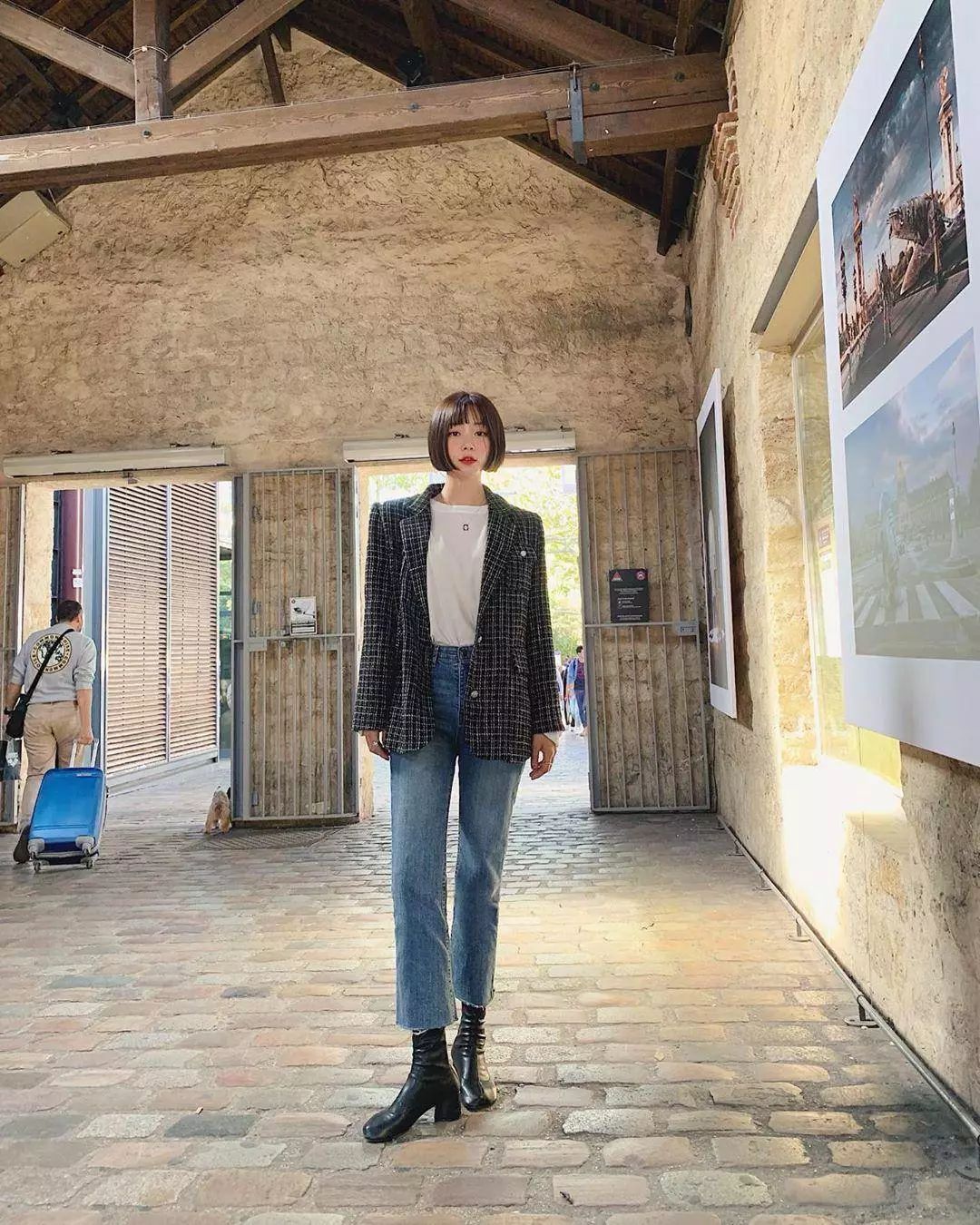 小香风是比较女人味的单品,混搭上帅气街头风的牛仔裤,瞬间就不一样了。