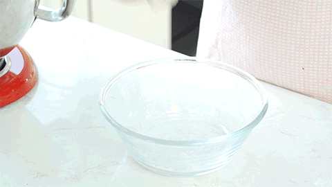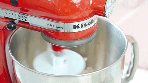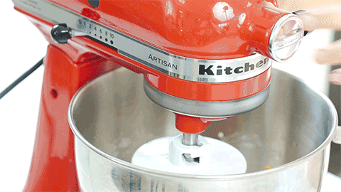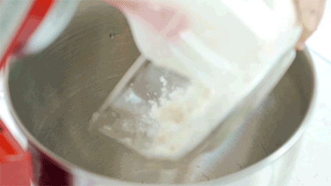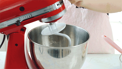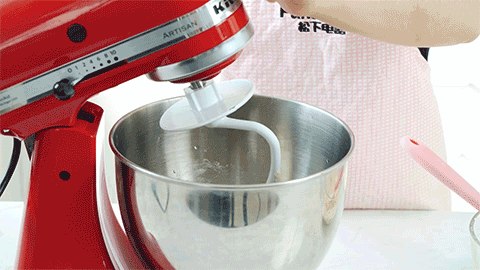 3. 一股脑倒进KitchenAid抬头式厨师机(5KSM125PSC 4.8L)中,先开2档搅拌至无干粉,再开4档继续搅~