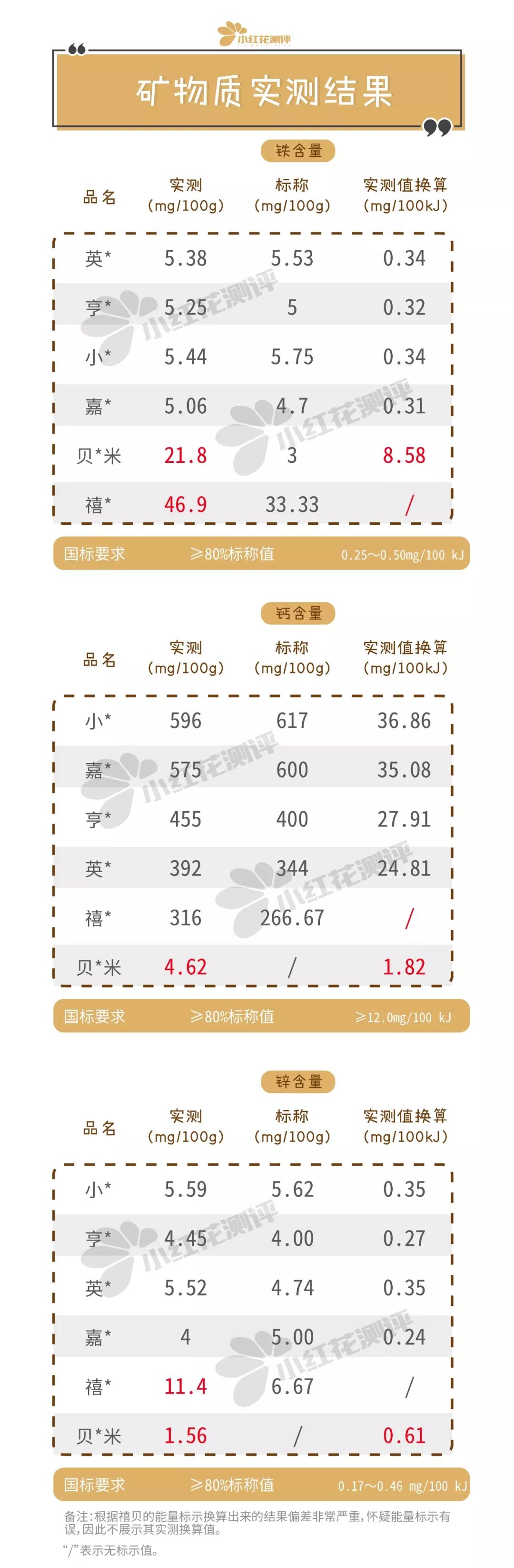 1. 小*、亨*和英*的钙铁锌含量均符合国标要求,其中小*的钙铁锌最接近标示值且含量相对较高,表现更好。2. 嘉*的锌实测值仅为标称值的80%,刚达到国标最低要求。3. 海淘米粉贝*米的钙、铁、锌含量均有出现严重偏高或偏低的问题,其中铁不仅远超标称值,还远远超出国标要求,且钙和锌均未有额外强化,实测含量也非常低。4. 另一款海淘米粉禧*不仅铁、锌含量远超国标参考值,钙含量也偏低。根据计算,如果每天吃50g,禧*和贝*米的每日铁补给量可以达到23.45mg/d和10.9mg/d。虽然没有超过1~3岁宝宝的每日铁最高耐受量25mg,但不排除加上其他饮食比如奶粉或者肉泥中的铁后会存在补铁过量的风险。补铁过量会影响其他微量元素的吸收,也会导致血色素沉着,抑或影响消化功能,导致便秘。国外由于母乳普及率高,且乳汁中的铁会不断降低,因而宝宝需要从辅食中获取更多的铁。但在国内,考虑到大部分宝宝吃的都是配方奶粉,花爸建议尽量不要选择海淘的高铁米粉。