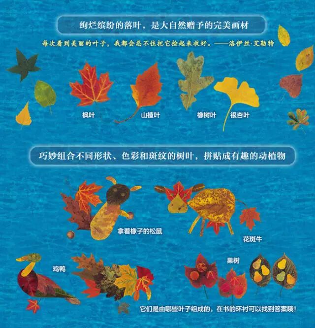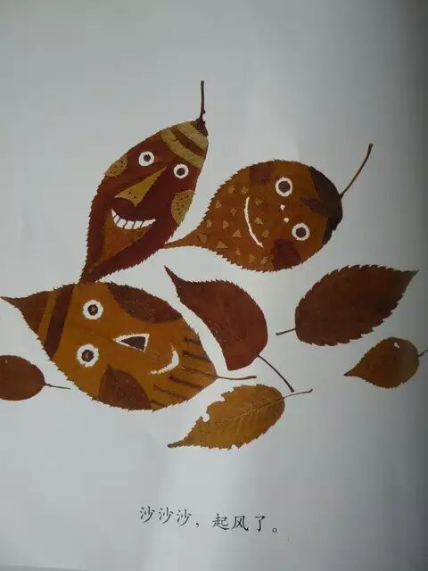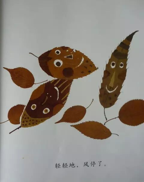 沙沙沙,起风了,在冬日寂静的树林里,一群落叶在快乐地跳舞……用实物剪贴的落叶形态各异,表情丰富,像魅惑的精灵,带出作者心中丰盈的诗意。小朋友还可以和爸爸妈妈一起用树叶来黏贴处各种造型哦!说不定比落叶跳舞还要美哦!
