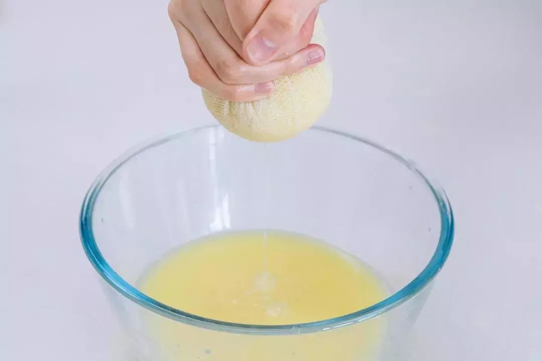 4. 用纱布滤出所有的姜汁。除了用纱布,60目网筛也能过滤。
