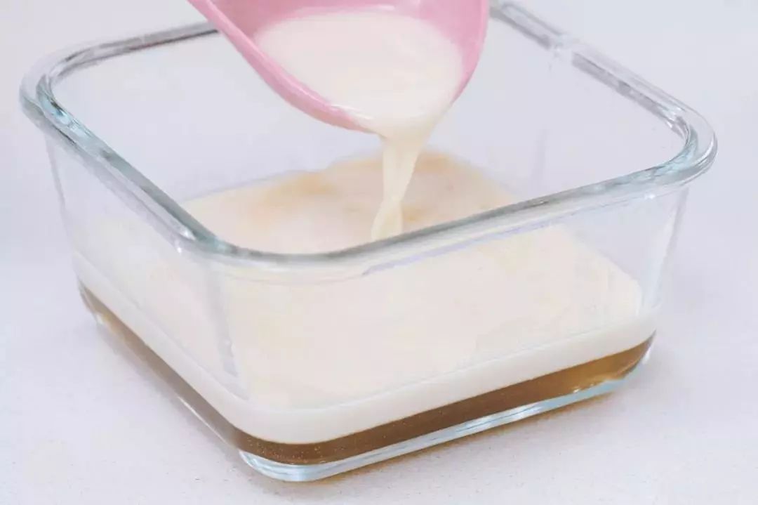 11. 取一个玻璃容器,在底部淋一勺黄糖粉浆,高度大约半厘米。