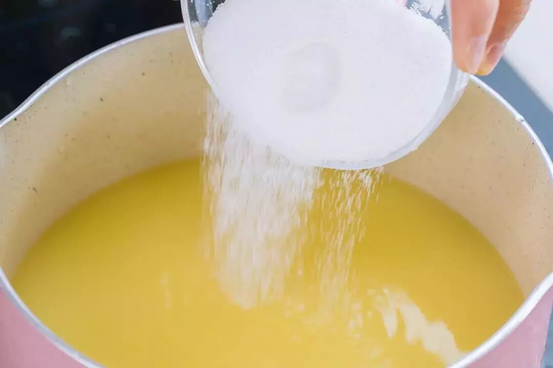 8. 滤好的姜汁,加165g细砂糖用小火煮化。