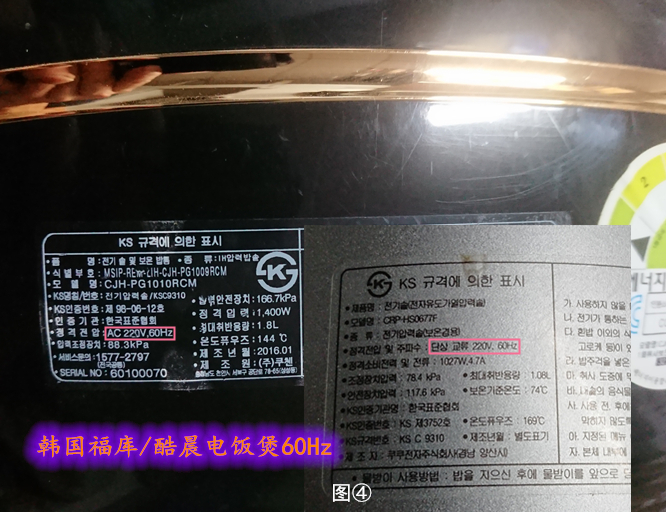 2、值得注意的韩系电饭煲,要分清在韩国本土的电饭煲是使用民用交流电压220V频率60Hz,而我国的民用电压是交流220V频率50Hz,60Hz的频率是不太适合我们使用的,但国内不少用户买的韩国电饭煲60赫兹的频率使用直到维修,其中2~4年间都正常案例也不少,不过凭广州李师傅专业维修经验,建议各位买家最好选购适合国内电压频率的电饭煲如图④。