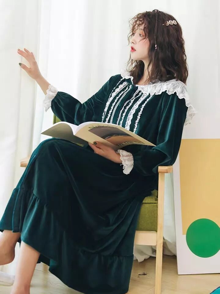 让橘子君最欲罢不能的一款:墨绿色丝绒材质配上领口的白色蕾丝,穿上它你就是中世纪城堡公主啊!和我一样的宫廷风爱好者举个爪呗~