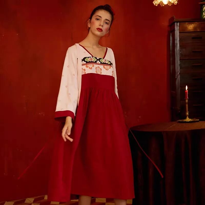 汉服爱好者必买系列吧,大红+黑白的配色,还有那随意点缀的小花朵,满满的中国风!感觉大A字蓬松的版型也很适合孕妇穿哟~