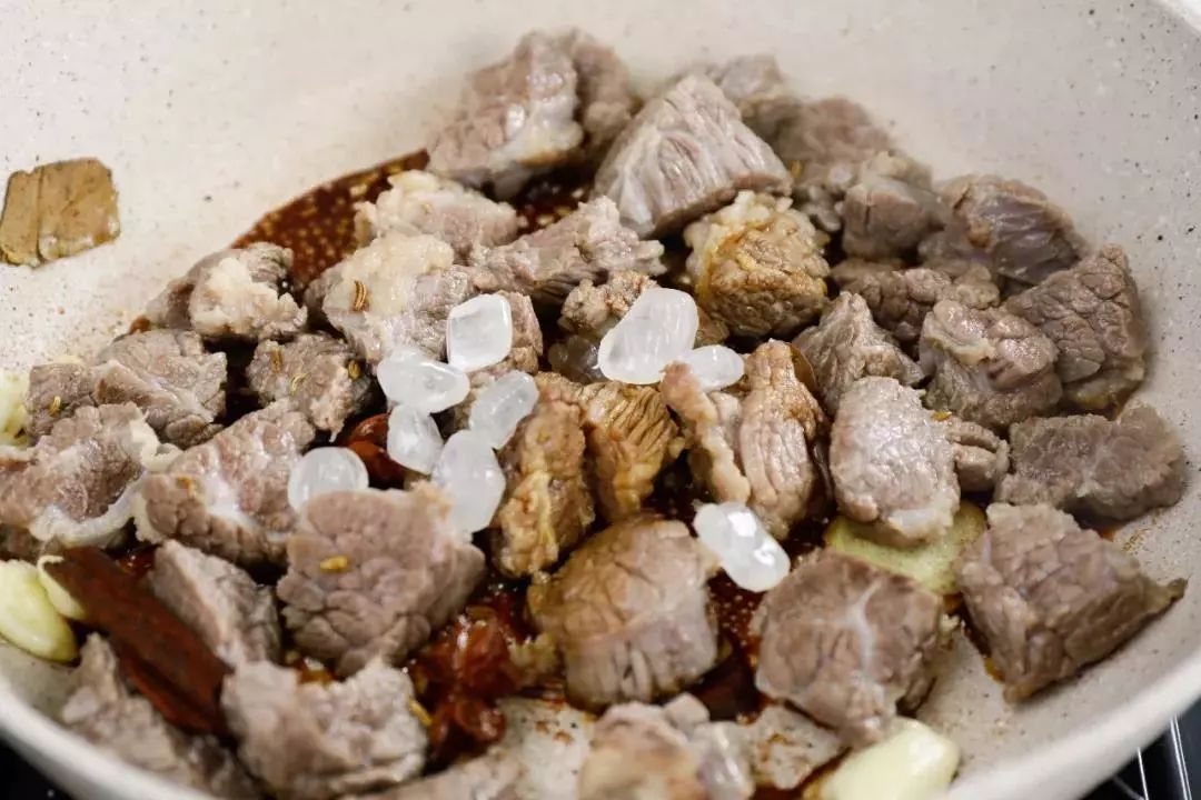 5. 再倒入焯好水的牛肉,加入15g生抽、15g冰糖、适量盐继续大火翻炒均匀。