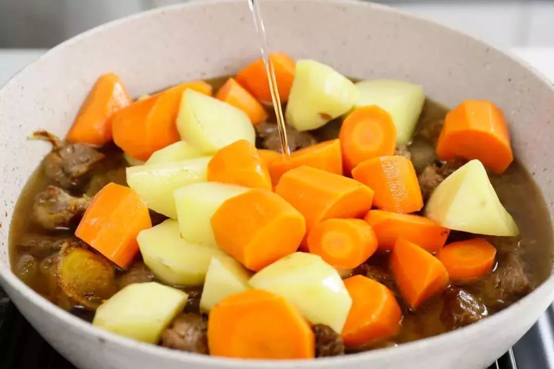 6. 倒入提前炒过的土豆和萝卜块,加入没过食材的清水,大火烧开后转中小火焖煮约30分钟即可。