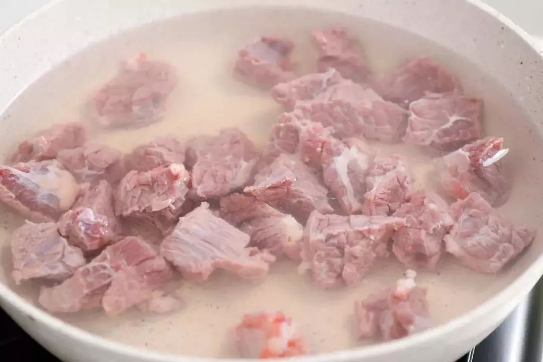 2. 大火烧开水,将切好的600g牛肉焯水去血沫,控水备用。