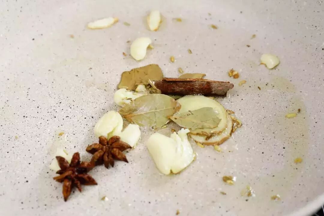 4. 锅中重新倒油,加入5片姜、3瓣蒜、2个八角、1片桂皮、少许香叶、少许茴香大火炒出香味。