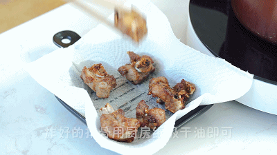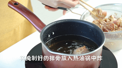 3. 先来做油炸版:倒油入锅,中火加热,放入腌制好的排骨,每炸一段时间就翻面,直至炸到两面金黄即可捞出