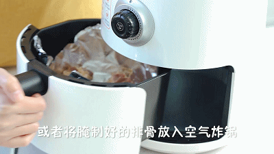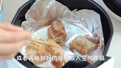 4. 再来做空气炸锅版:将腌制好的排骨肉厚的一面朝上放在铺好锡纸的西屋空气炸锅中,温度调至200度,烤8~10分钟左右