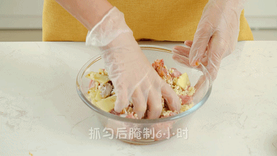 2. 准备一个碗,将排骨、料酒、生抽、盐、蚝油、淀粉、孜然粉、姜片和蒜末放入碗中,用手抓匀,盖上保鲜膜,放冰箱冷藏腌制6小时