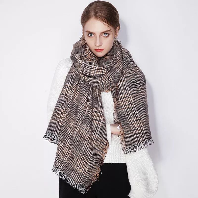 千鸟格纹的围巾,满满的英伦风设计,搭配一件相近色系的呢子大衣,仿佛走在国外的街头~