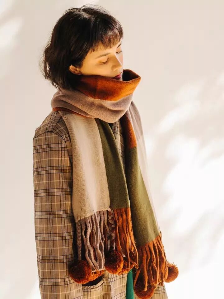 马卡龙色系的小围巾,尾部还是流苏小球球,原来拼色也可以俏皮可爱~
