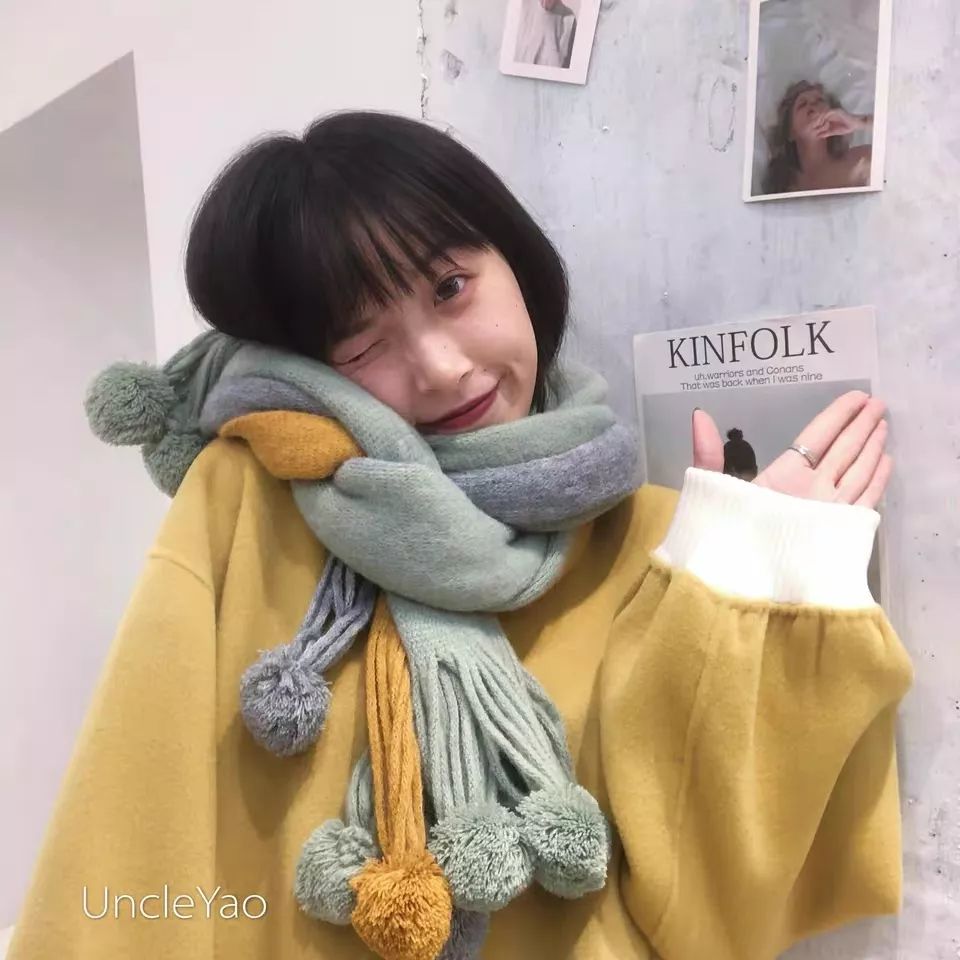 马卡龙色系的小围巾,尾部还是流苏小球球,原来拼色也可以俏皮可爱~