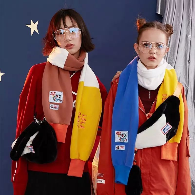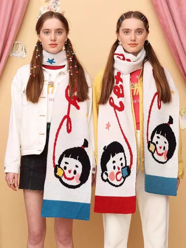 卡通动漫风的围巾,比较适合少女心不老的女生,披上一秒回到青春校园课堂。