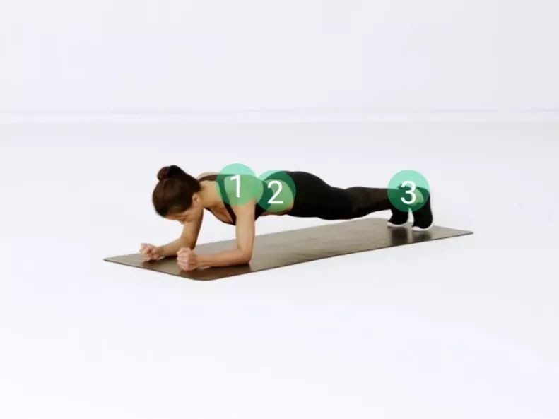 要点:屈肘,小臂与前脚掌撑地,用力撑高身体;收紧腹部,不能塌腰;耳、肩、髋、膝、踝呈同一条直线,加强身体的核心力量。