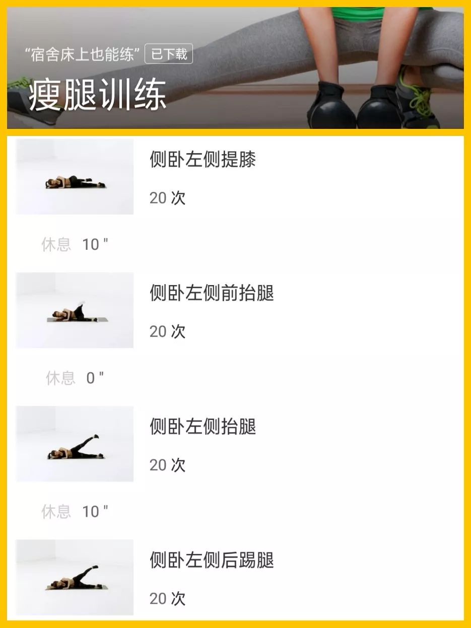 肌肉松软下来以后,就要配合运动消灭脂肪啦。keep这个瘦腿训练还蛮管用的,在床上就能练。橘子君记录了一下,连续做19次以后,腿围瘦了3cm,而且双腿在视觉上更加笔直了!