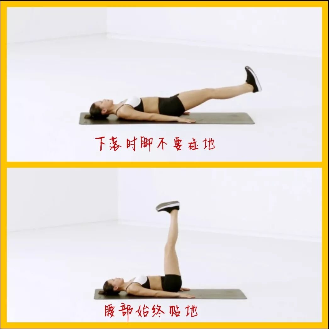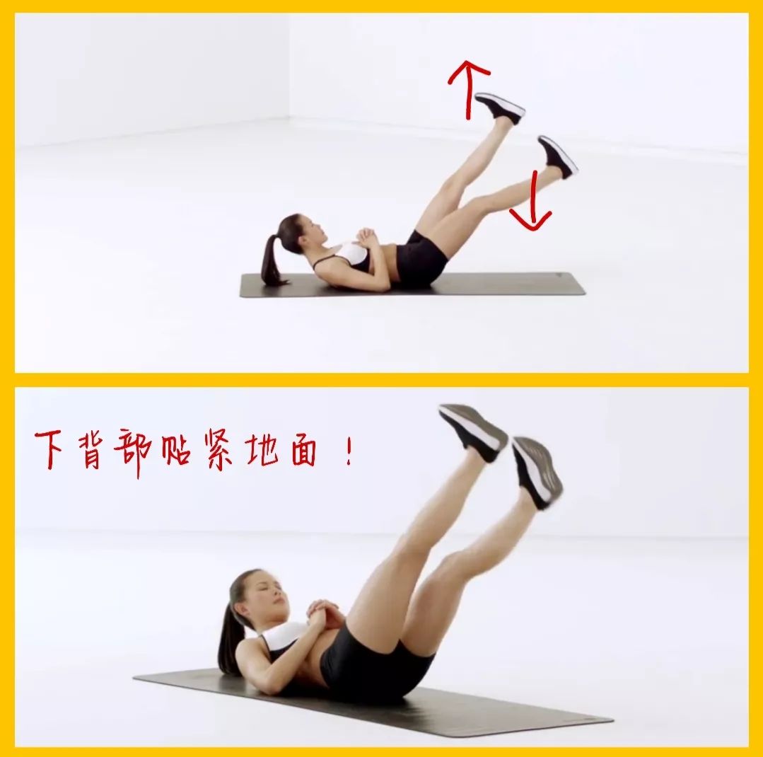 要点:下背部用力贴紧地面,双腿伸直,勾起脚尖,双腿交替在与地面45°角和70°角的区间抬起落下,如果你感觉整个腹肌都紧绷而灼烧,那动作的发力点就对啦。