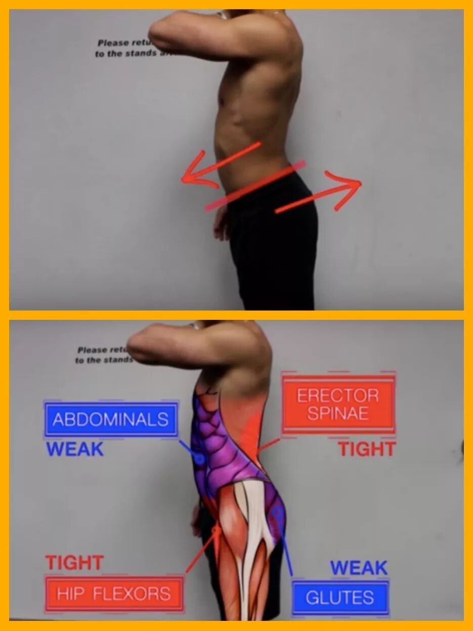 身体站得笔直,在镜子前观察自己的体型,是否存在小腹前凸+臀部后突的现象,如图所示~