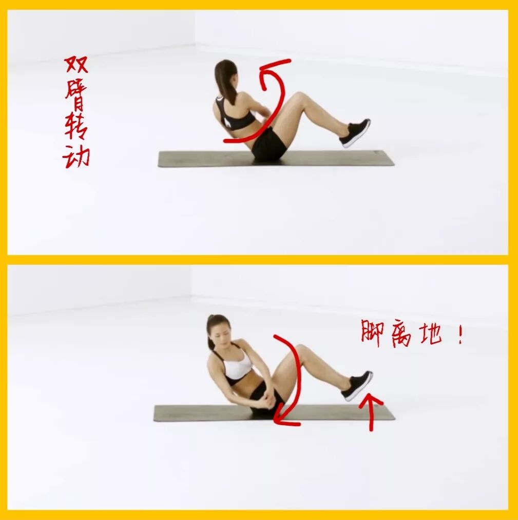 要点:双腿屈膝抬起,脚要离地,下背要挺直,然后转动双肩来带动手臂,让手接触两侧地面,整个过程腹肌要有意识绷紧~这个动作能很好地消除两侧脂肪,让腰部更加纤细哦。
