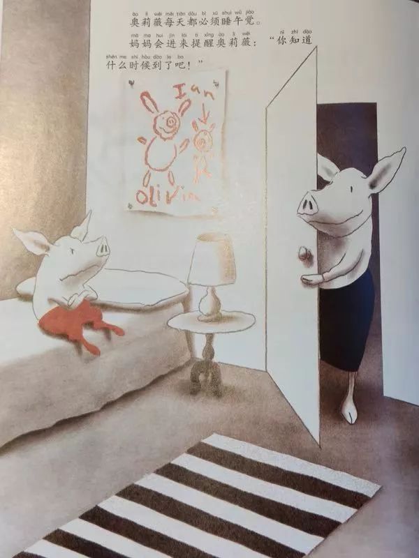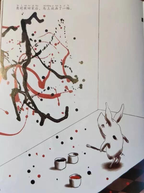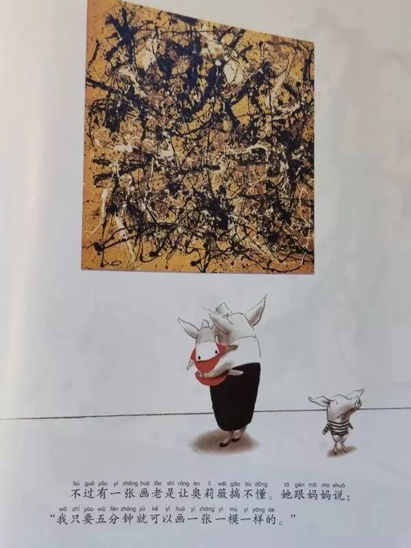 不过有一张画她老是搞不懂,就是波拉克的《秋天的韵律30号》,她对妈妈说,这样的画,我只要五分钟,就可以画一幅一模一样的。回到家里,她就真的在墙上画了起来……一起跟着绘本听长颈鹿姐姐讲奥莉薇的故事吧~