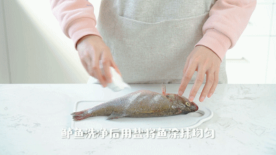 1. 处理好的鲈鱼洗净后用厨房纸吸干水分,再用2g盐将其涂抹均匀,放一旁备用