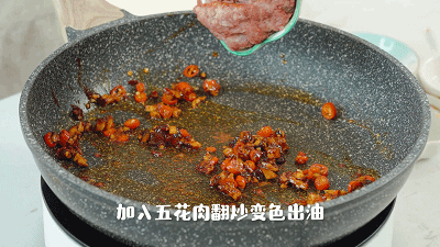 5. 往锅中倒入五花肉末,翻炒至变色出油