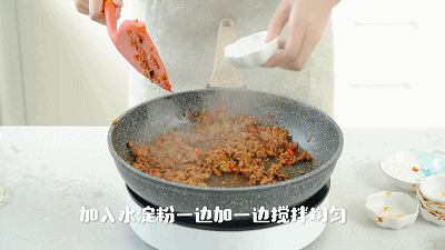 6. 倒入水淀粉,一边加一边搅拌均匀至粘稠状态后,倒入蒸鱼豉油搅拌均匀,肉酱就做好啦