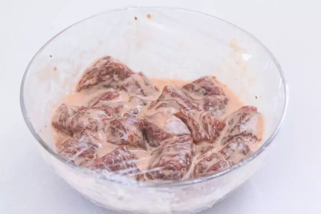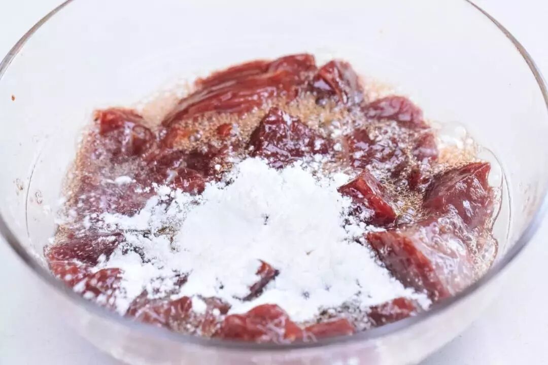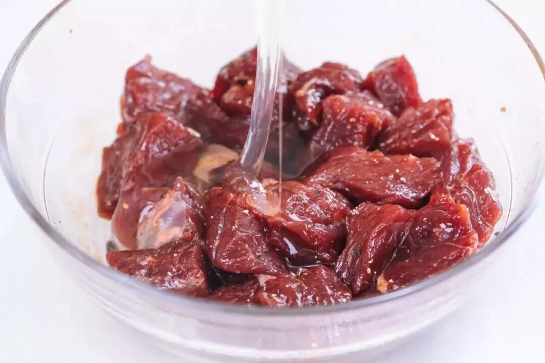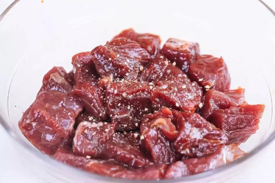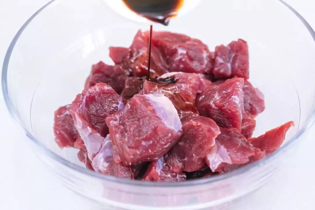 1. 300g牛里脊切粒,加10g生抽拌匀。
