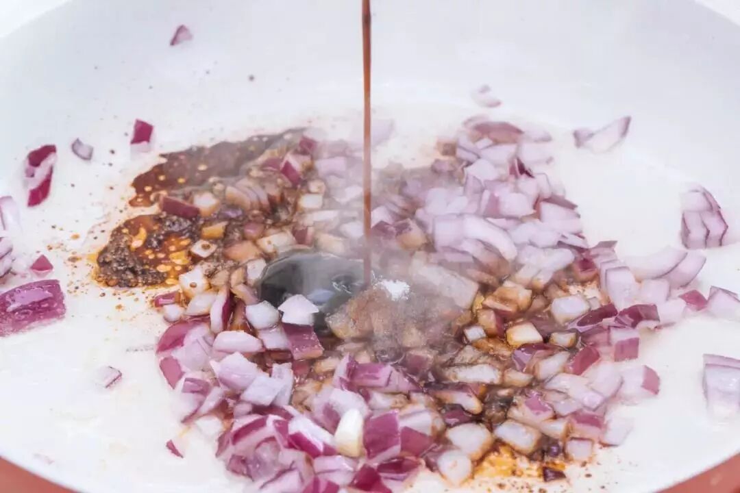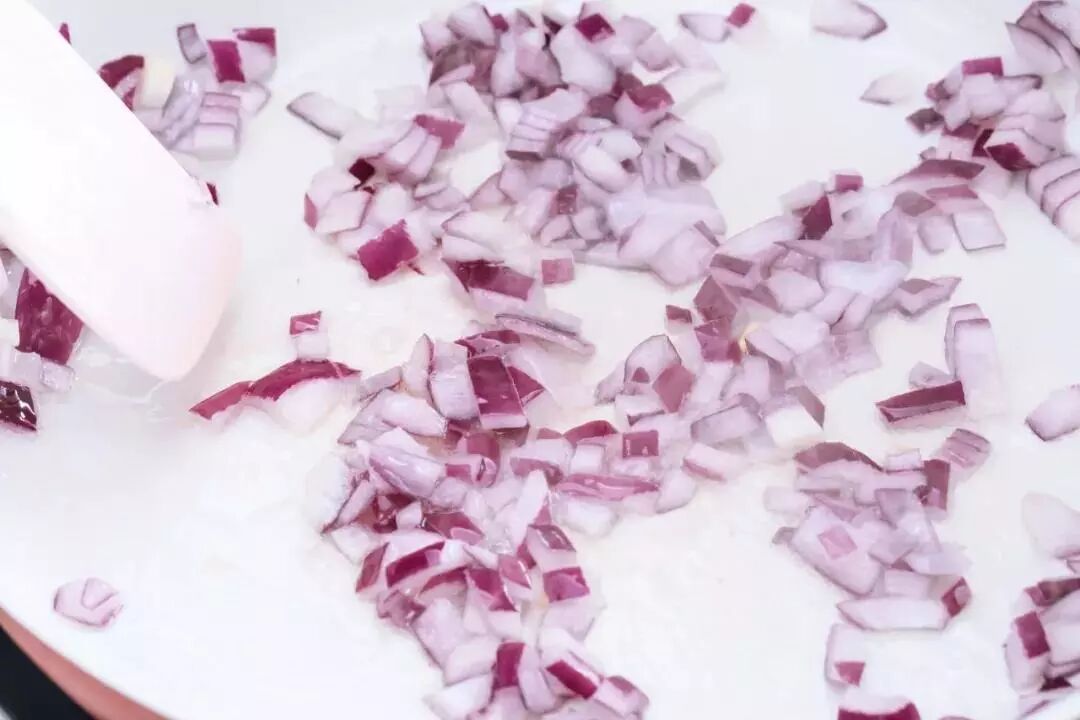 8. 用锅内剩下的油,继续稍微翻炒几下提前切好的100g洋葱粒。