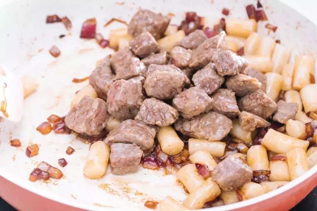 11. 最后加入牛肉粒翻炒均匀即可出锅。