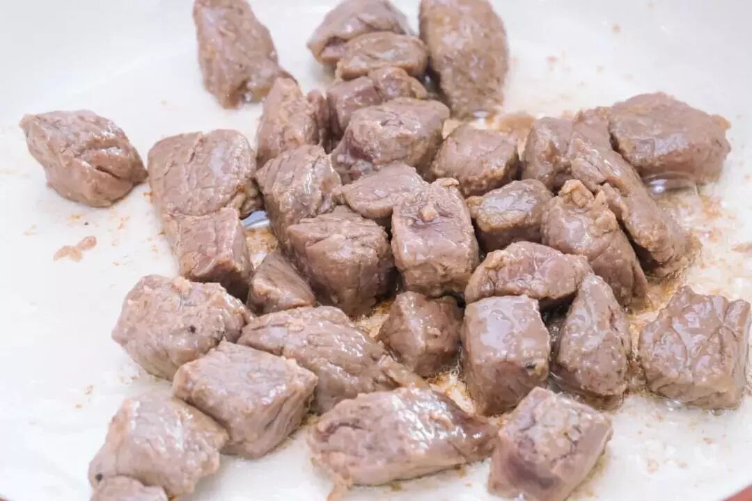 7. 不粘锅加30g大豆油烧热后下牛肉粒,翻炒至表面上色出锅。