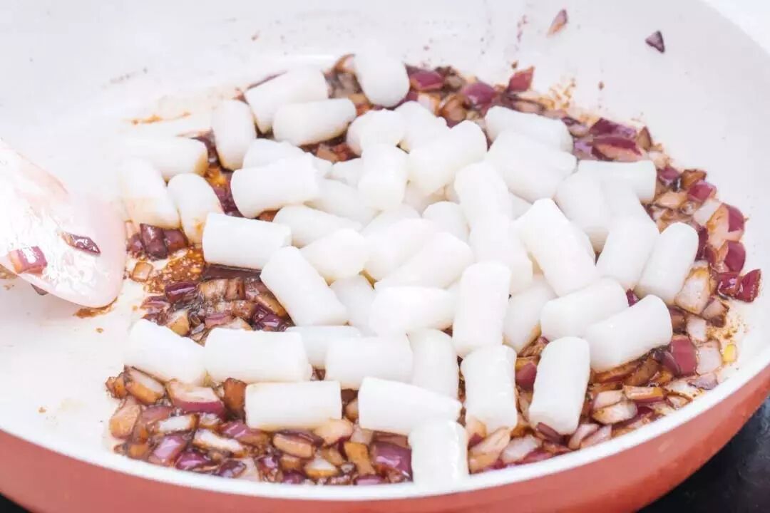 6. 200g年糕切小段,沸水煮约2分钟,至全部浮起捞出待用。