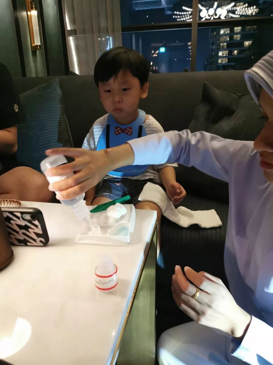 吃饭的时候张小迪不小心把手扎了,马上来了个护士帮忙包扎,餐厅经理过来看了几次,第一句话是”真的很抱歉,因为有小宝宝,我们不应该放尖锐的叉子“