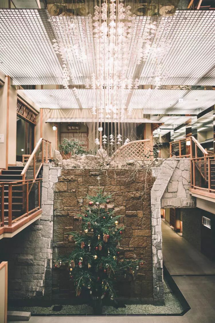 (从左到右:通往gift shop的小桥,Lobby区域,圣诞树景观)