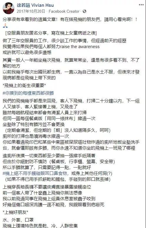 事件发生后,一名多年机的空乘人员,在朋友圈写下飞机上一些不为人知的卫生问题,被包括徐若瑄在内的无数大V明星转发。