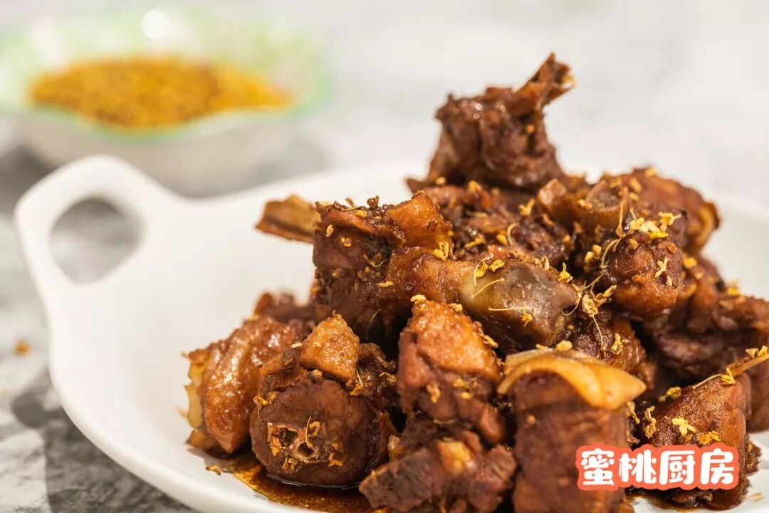 这道菜还特别添加了干桂花。除了也有一定药用功效外,它还能起到增香装饰的作用。